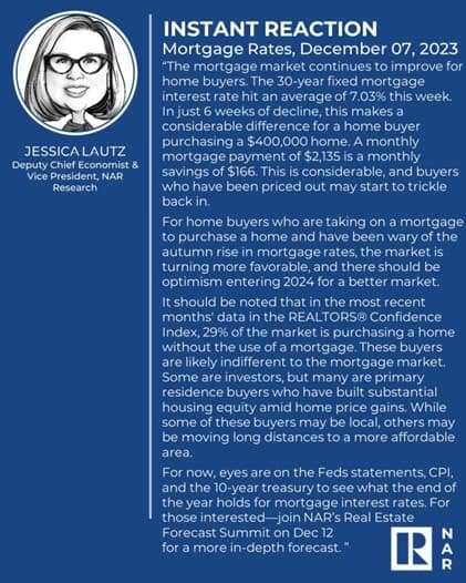 The National Association of Realtors also published quotes from Dr. Lawrence Yun, the chief economist at NAR, and Jessica Lautz, the Deputy Chief economist. Lawrence reminds us that interests are only part of the equation that determines when and for how much people buy their home. Compared to pre-pandemic levels “there are 4.7 million more Americans working now”. “Mortgage rate movements may determine entry timing, but jobs are the source of long-term housing demand, which keeps growing.” From my perspective, this is where Puget Sound is doing well. I am frequently seeing people from across the nation come to the greater Seattle area for our high tech jobs. Jessica points out that even since December 1st, mortgage rates have already dropped to 7.03%. Keep in mind that 68% of home buyers have either 50% or more home equity, so interest rates may be of no effect to them. Even this little bit “makes a considerable difference for a home buyer purchasing a $400,000 home.” As mortgage rates continue to decline as predicted heading into 2024, more and more buyers that are otherwise jumping at the bit to buy will be priced in. If you want to read Lawrence and Jessica’s full statements they have been included below.