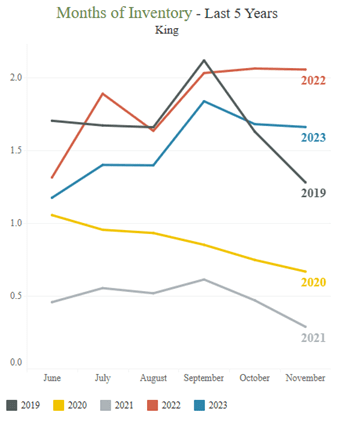 Pertaining specifically to King County, the median sales price was $799,925. This ranks second in the highest priced counties in the NWMLS region beaten only by San Juan at $975,000. The total months of inventory in King County has stabilized around 1.7 for the past several months. This means that if no new houses went up for sale, at current demand levels, all houses would sell in 1.7 months. A healthy market is generally considered to be between 4 and 6 months. Last year saw higher levels of inventory in King County in November, but 2023 still shows more inventory than 2019, 2020, and 2021 at this time. The number of active listings is 1,889 down from last year’s 2,694, an approximately 30% decrease.